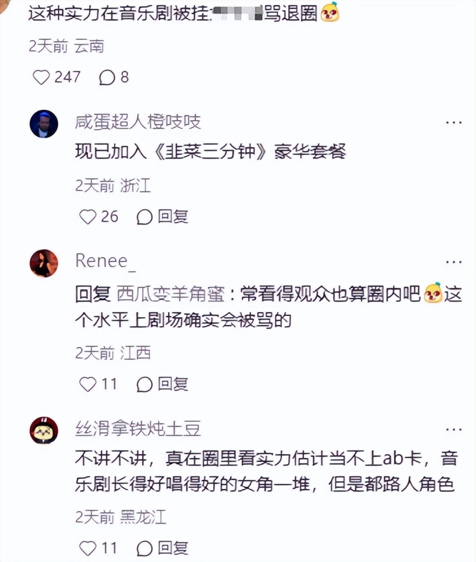她秀的一段音乐剧表演,在真正的音乐剧圈完全不够看,是处于龙套的位置。